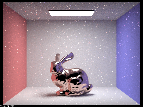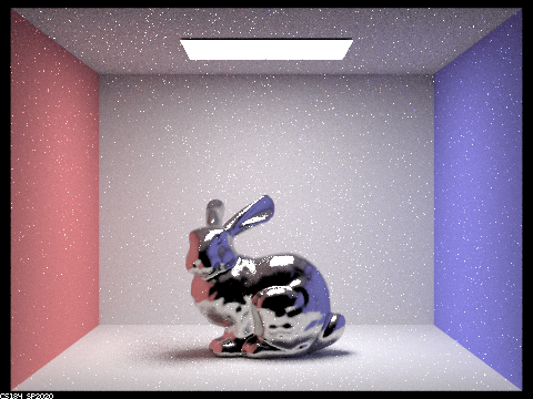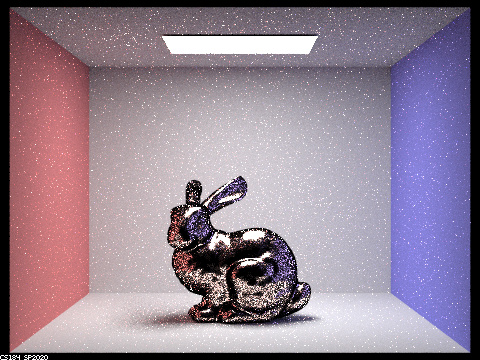 Lastly, we render the same CBbunny but in cobalt. The cobalt bunny has very similar specular properties to the copper bunny, probably because cobalt and copper are pretty similar. At least the color is different. To change the metal, I used this website to look up the refractive index (η) and extinction coefficient (k) of cobalt at the fixed wavelengths for the R,G,B channels. Parameters listed below.