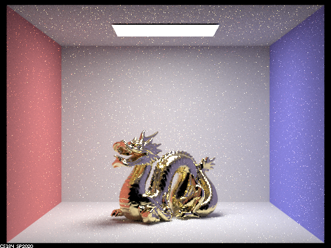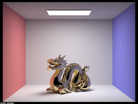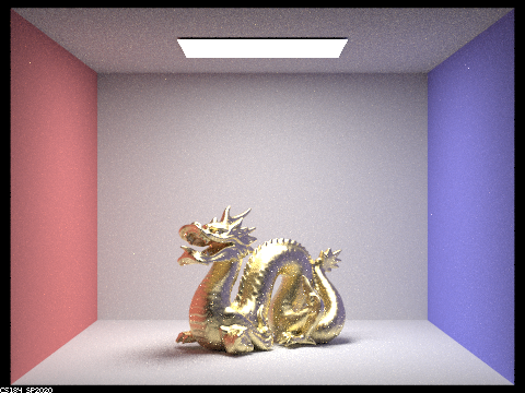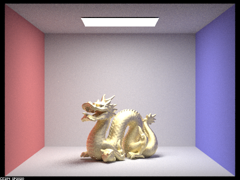 Below we display the effect of the roughness coefficient α in the normal distribution function. Notice the dragon's gold surface change in appearance as α changes. As α increases, the surface becomes rougher and diffuses light more evenly. When α is small, the surface is smoother and has a more glossy look because there is more reflection. All images are sampled with 128 samples per pixel, 1 sample per light, and have a max ray depth of 5.
