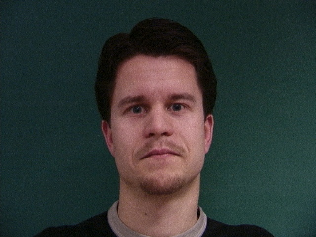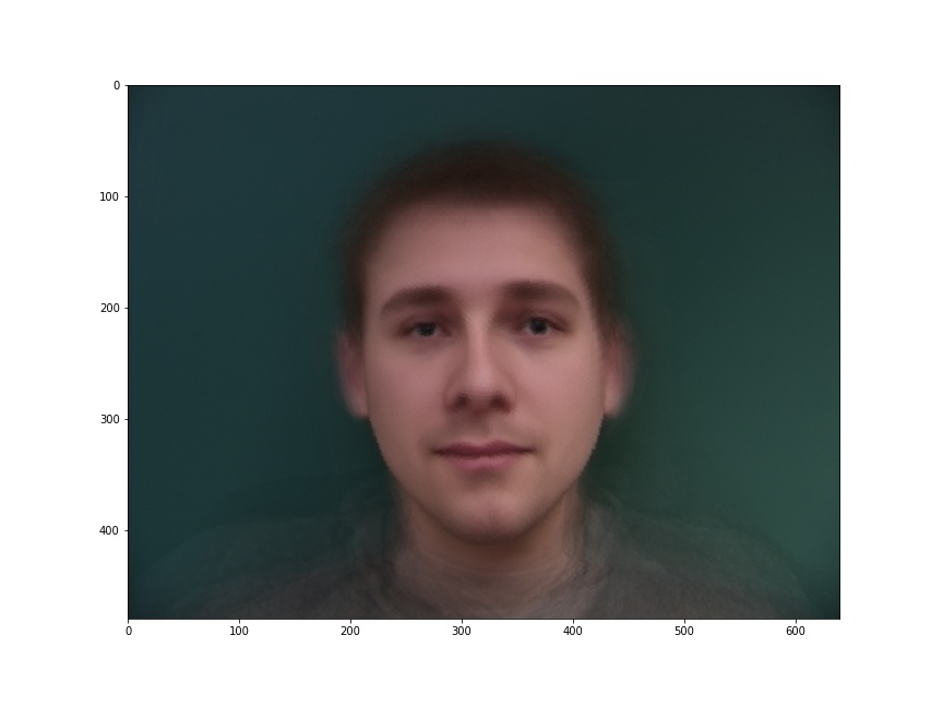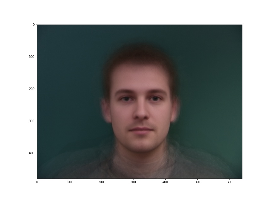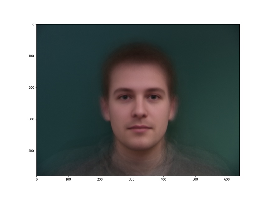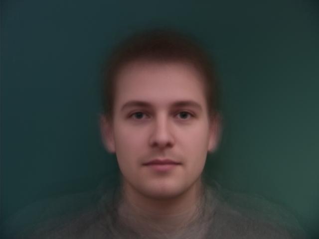 Here is my face warped into the average shape, and the average face of the population warped into my face geometry.
