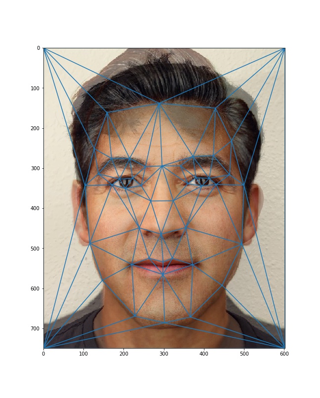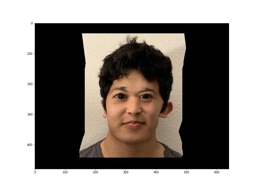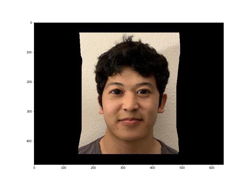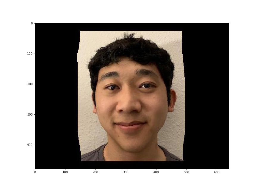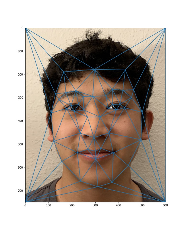 To compute the mid-way face, I first found the average shape of our faces by averaging the two sets of correspondence points. Then, I warped both faces to the average shape and cross-dissolved the colors of both images together. To get appropriate pixels from the original images into the morphed image, I use inverse warping with the affine transformation matrices of each original shape to the average shape.