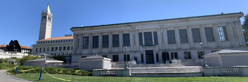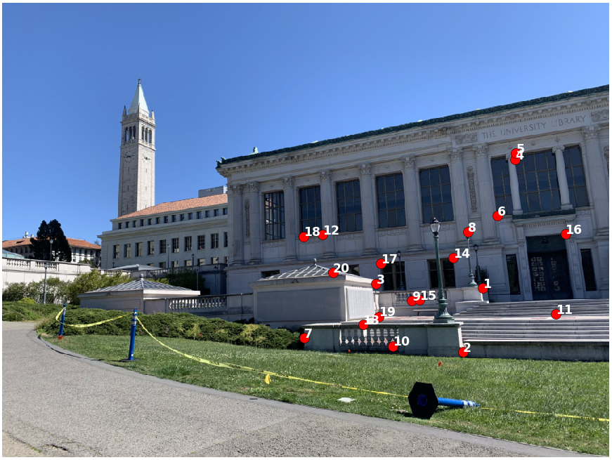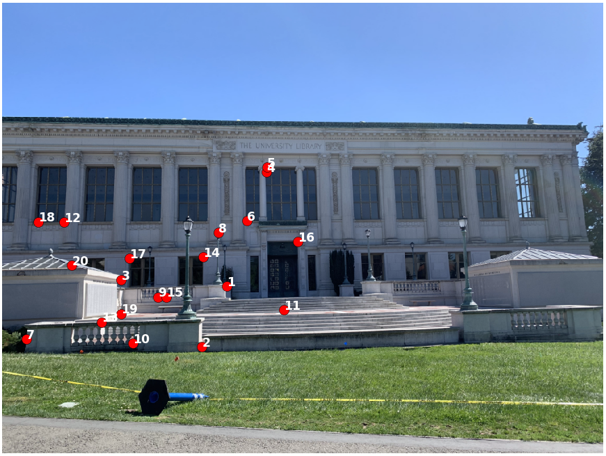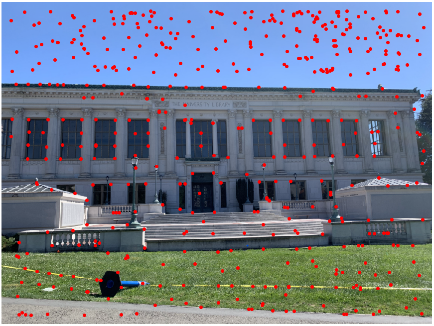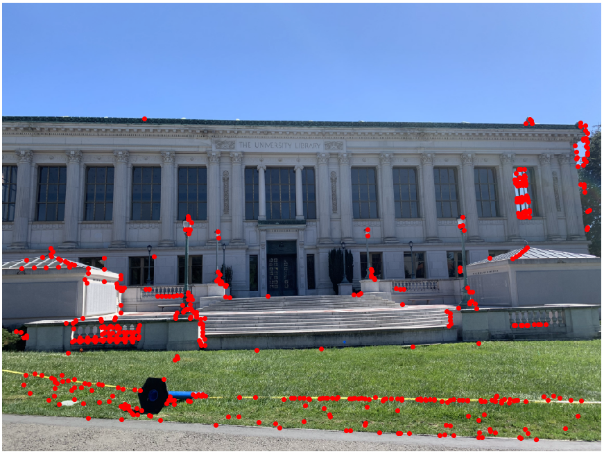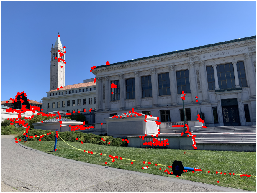 Using the same photos taken of Doe Library and the Campanile, we run the detector and get the following interest points in red: