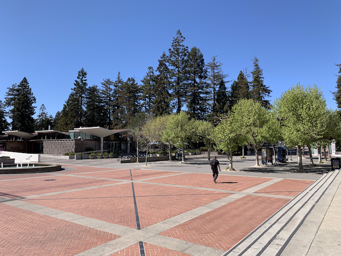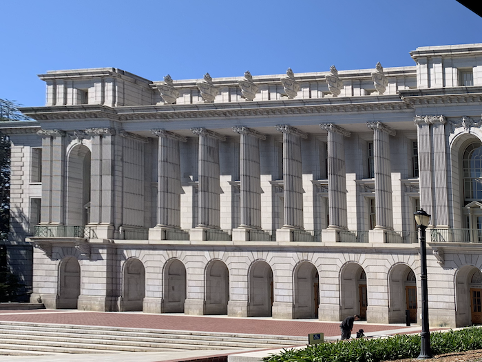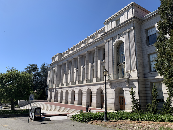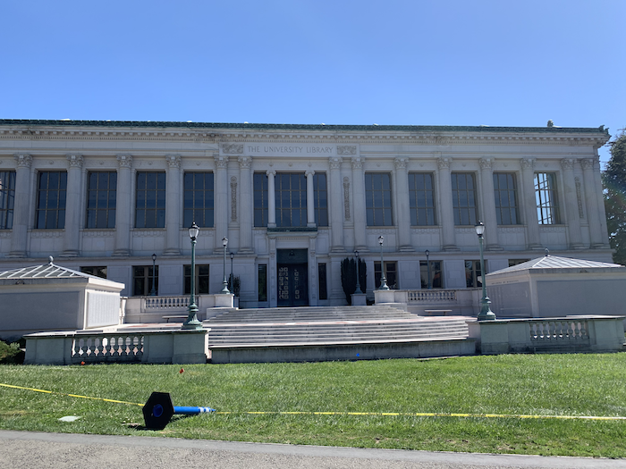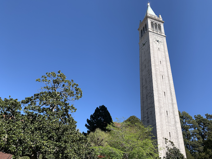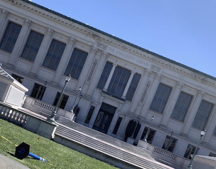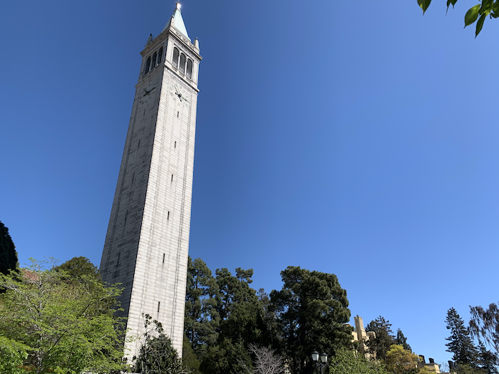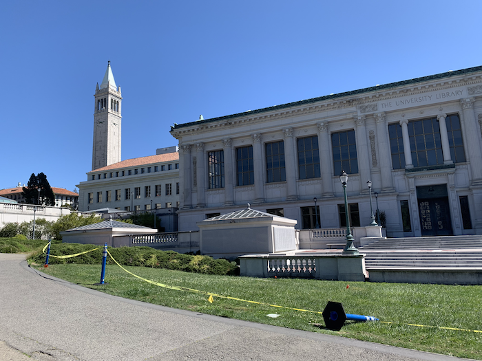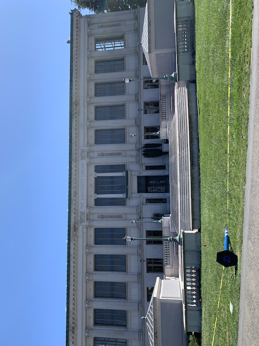 Using the same photos taken of Doe Library and the Campanile, we run the detector and get the following interest points in red:
