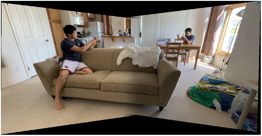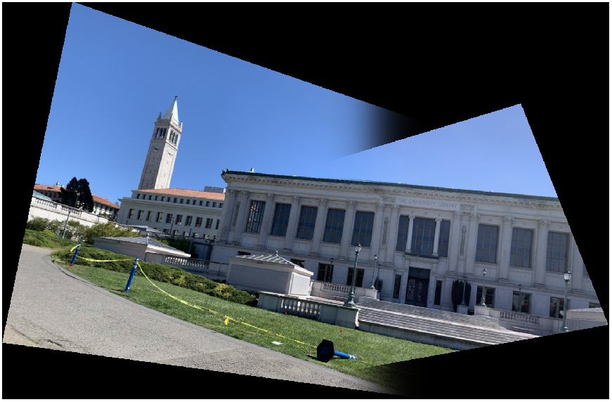 In order to stitch the images, I first created a blank canvas in which I could stack the images onto. The second image goes on first, then the first image on top, shifting the images accordingly before stacking. This essentially completes the process, but leaves some edge artifacts around the overlapping region. I used weighted averaging (feathering) to minimize these artifacts.
