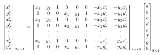 The above can be written as a series of linear equations. The 8x1 vector can be solved using least squares, and to fully recover the homography we add 1 to the end of the vector and reshape it into a 3x3 matrix.