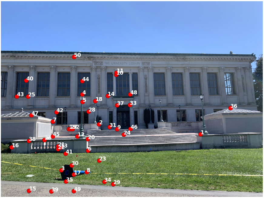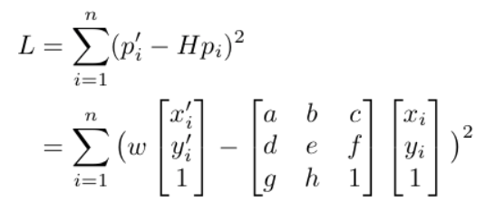 In this part, we recover homographies between two sets of points. We establish p' = Hp for all corresponding points p' and p, and solve for the homography H. Specifically, we want to minimize the loss given by our homography:i