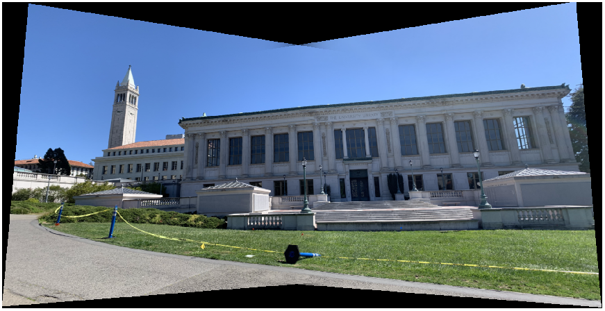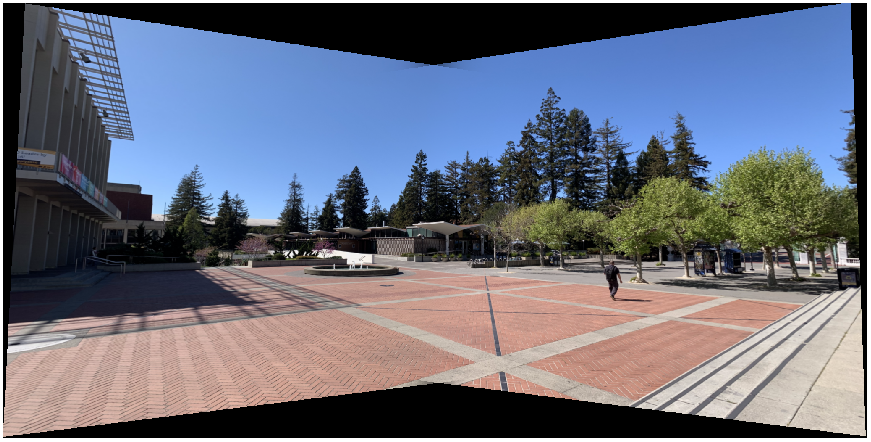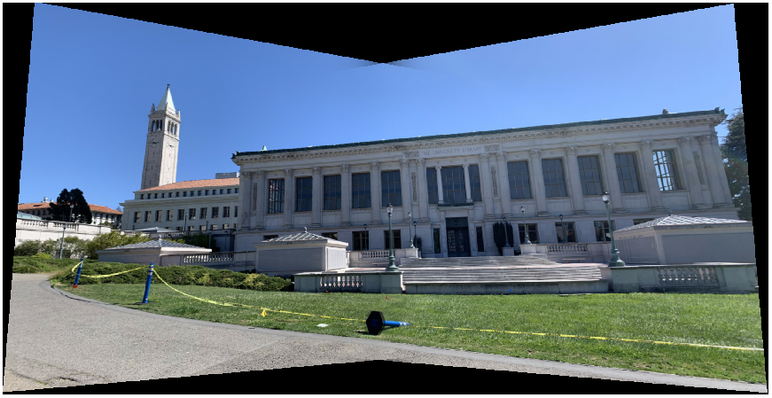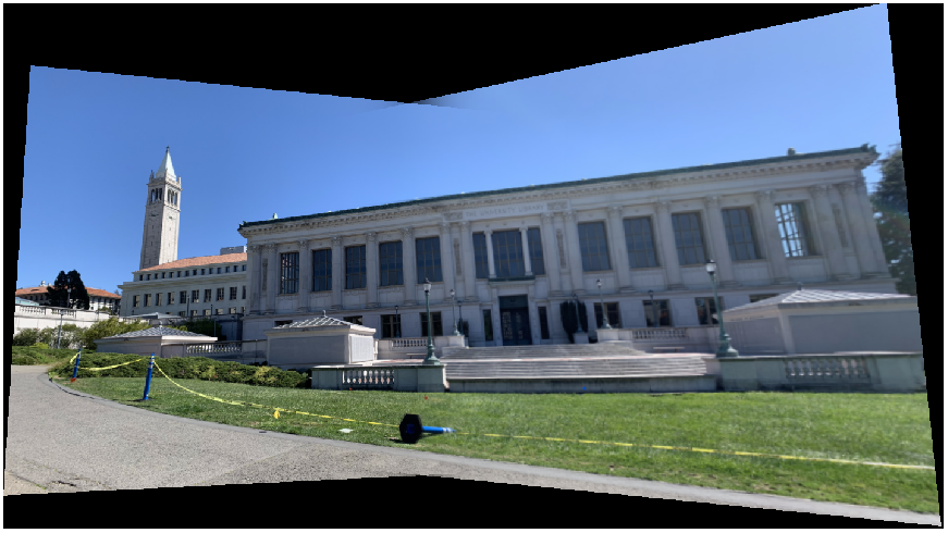 I first tried linear blending, which involves using a linearly decreasing weight from 1 to 0 over the overlapping region. Specifically, the pixel value in the overlapping region is determined by rgb = alpha * im1 + (1 - alpha) * im2, where alpha is the weight of the left image's pixel values in the final image for a column in the overlapping region. The weight alpha decreases linearly from 1 to 0 over the columns in the overlapping region for linear blending. This worked well in getting rid of edge artifacts, but also created wedge-like artifacts at the crossing sections. So, instead of a linearly decreasing weight, I tried using a sigmoid function to determine the weight alpha. Now columns closer to the left and right edges of the overlapping region will be influenced even more by the left and right images, respectively. This helped reduce the effect of the wedge artifacts.